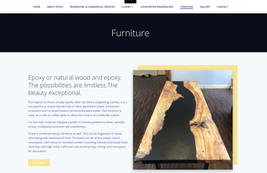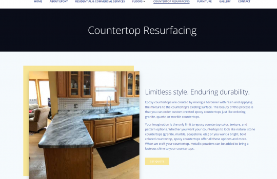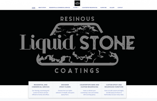 A resinous coatings producer, this company specializes in creating epoxy flooring. They also create countertop surfaces and furniture. They need a site that not only showcases their principal service – creating epoxy floors – but also highlights other creative applications. We love the dramatic look of their logo. We use it as a basis for the customization of a new WordPress installation. All of the copy for this site is written by us. Content is based on interviews with the owners and research into the Epoxy field.